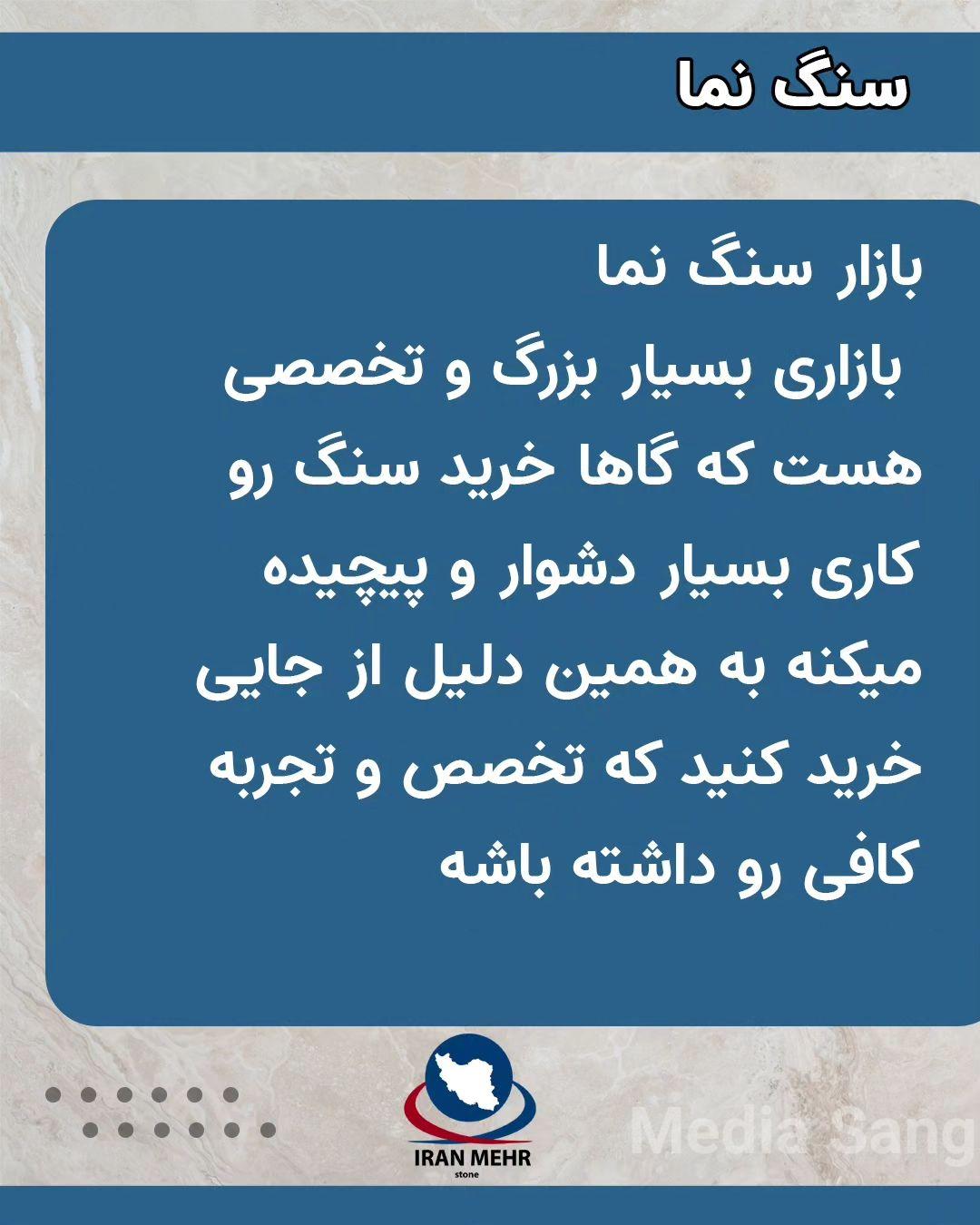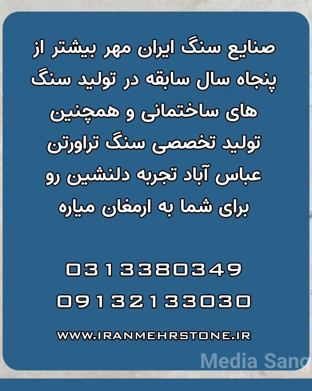 شما میتوانید از طریق مدیاسنگ به صورت مستقیم وبدون واسطه از سنگبری ایران مهر خرید کنید وهمچنین می توانید تمامی محصولات صنایع سنگ ایران مهر را از طریق مدیا سنگ ببینید