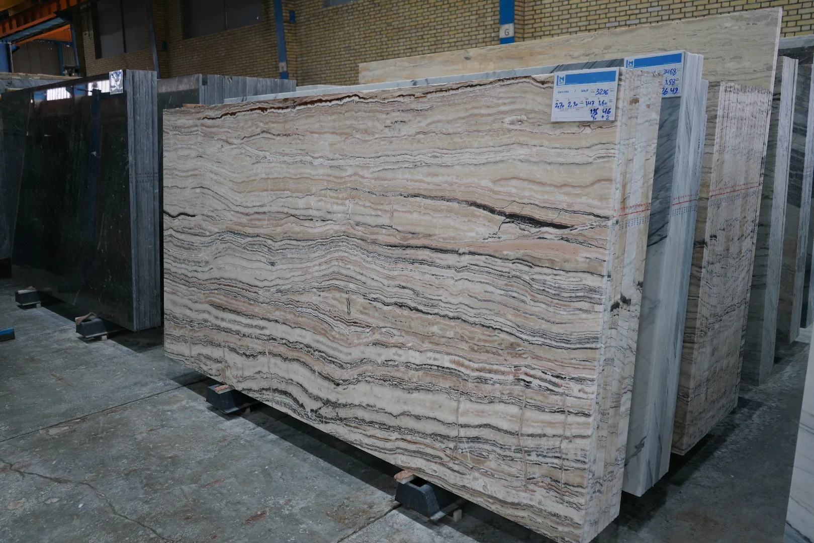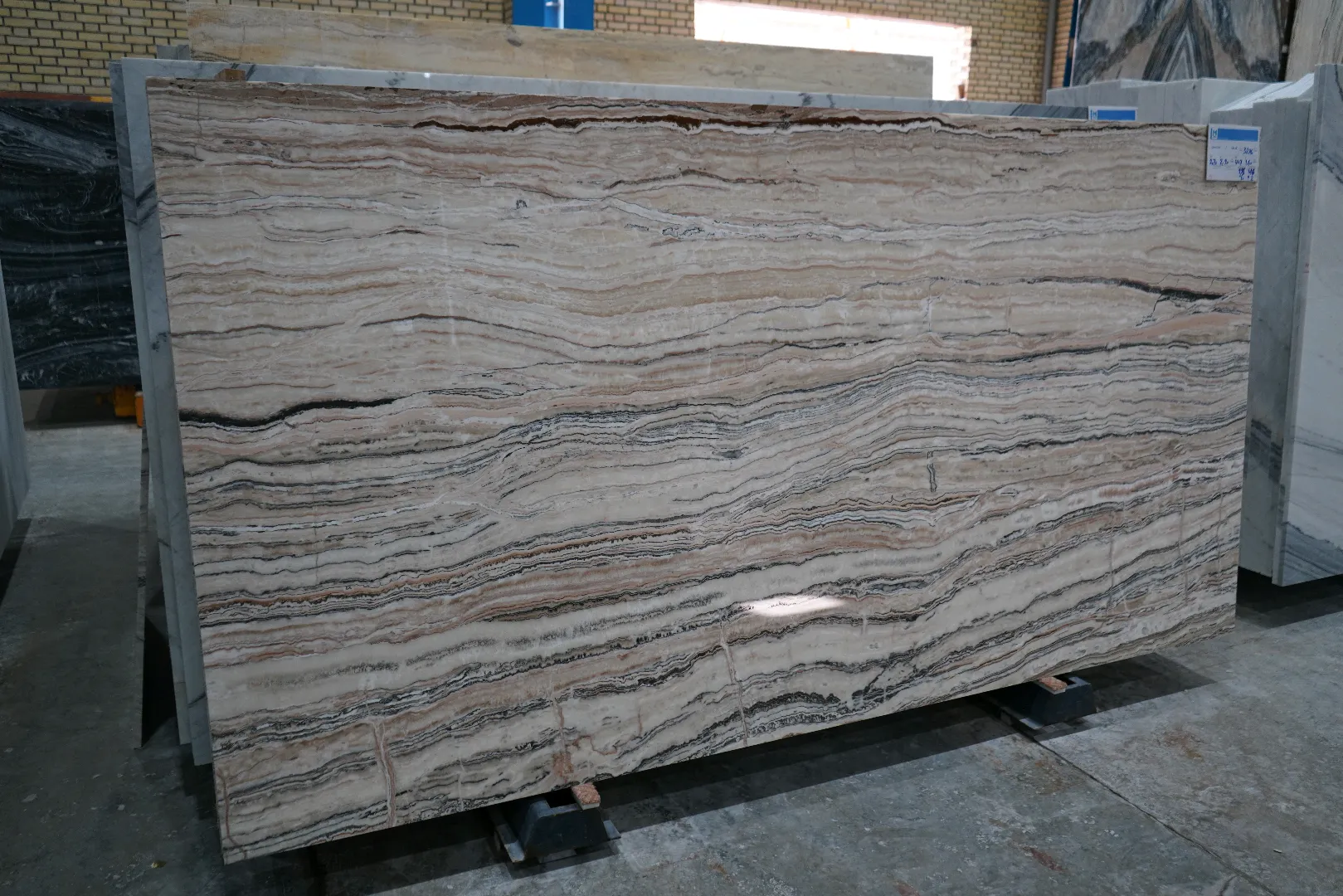 سنگ اسلب تراونیکس کارمانیا در صورتی که موجدار بریده و فرآوری گردد ، لایه های تراورتن و مرمر کاملا در سنگ مشهود بوده و قسمت های مرمر این سنگ قابلیت عبور نور را دارد که این ویژگی باعث شده که طرفداران بسیار زیادی پیدا کند زیرا یکی از بهترین گزینه ها برای استفاده در